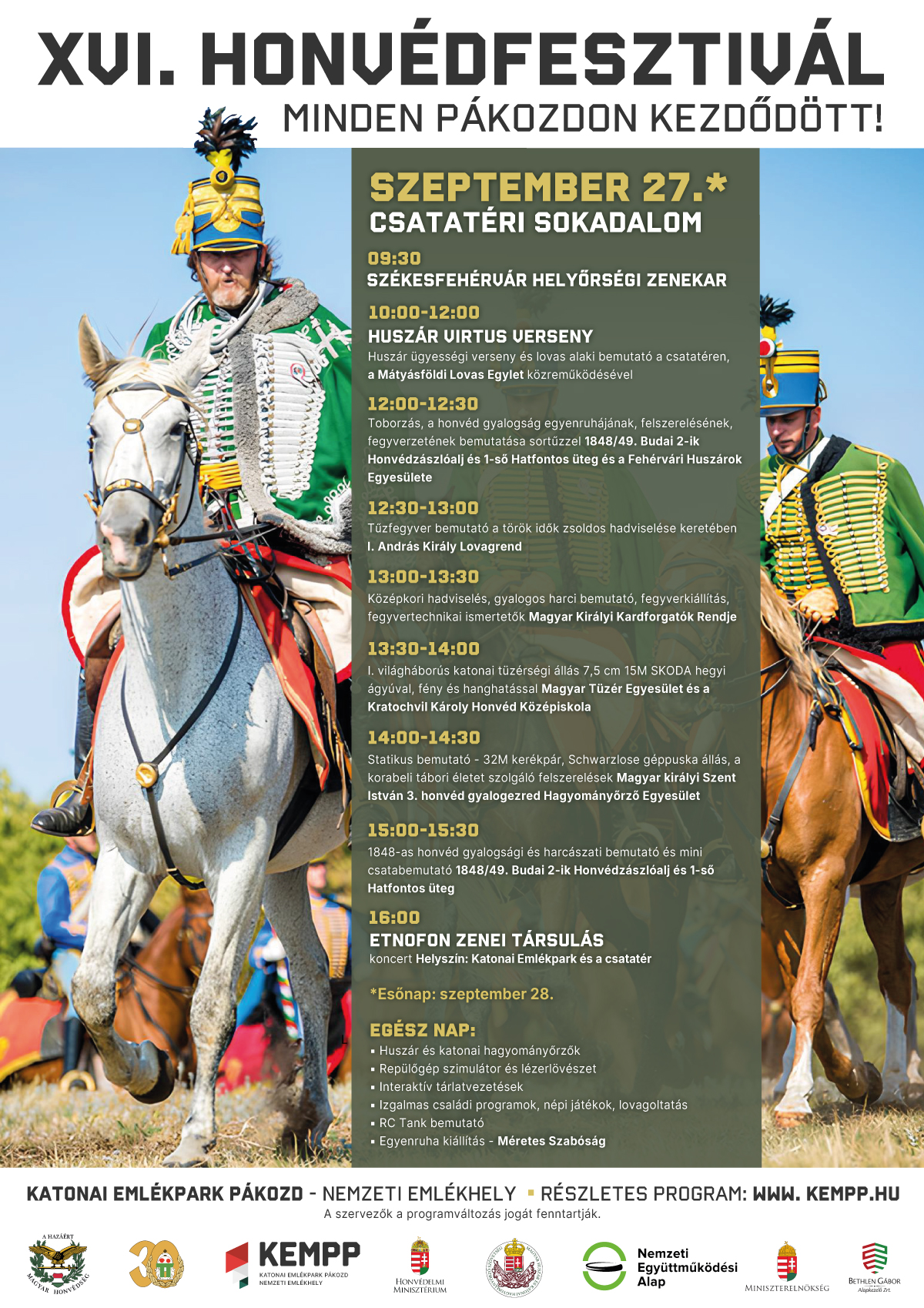 Szeptember végén újra különleges élményekkel vár mindenkit a Katonai Emlékpark. Az 1848-as pákozd-pátka-sukorói győztes csata 177. évfordulója alkalmából szeptember 27-29. között a Katonai Emlékpark Pákozd - Nemzeti Emlékhely és a Honvédség és Társadalom Baráti Kör Székesfehérvári Szervezetének rendezésében kerül sor a XVI. Honvédfesztiválra. A rendezvénysorozat a családokat, történelemrajongókat és minden korosztályt izgalmas programokkal és ünnepi eseményekkel vár.